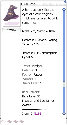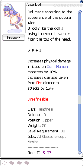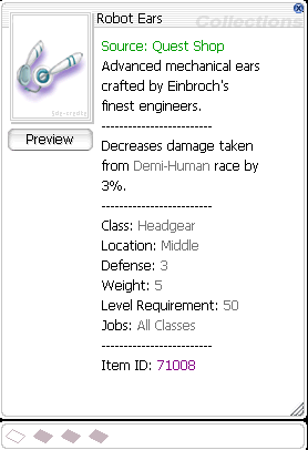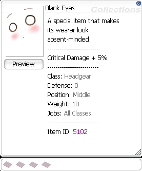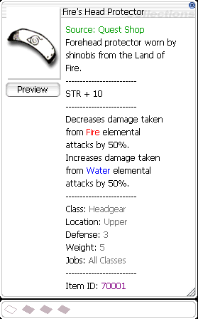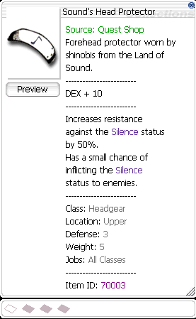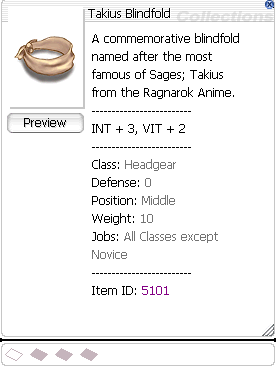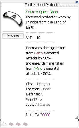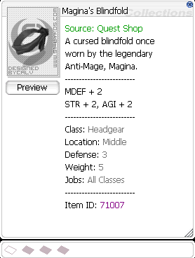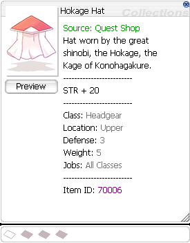 <table data-view="cards"><thead><tr><th align="center"></th><th></th></tr></thead><tbody><tr><td align="center"><strong>Takius Bilndfold [1]</strong><br><img src="https://1103472633-files.gitbook.io/~/files/v0/b/gitbook-x-prod.appspot.com/o/spaces%2FrX90ByJfuDn6daOeI1A0%2Fuploads%2FraxILRxs5xbpHPlXhw7q%2FQuest%20-%20Takius.png?alt=media&#x26;token=591e53b0-1cf3-4882-9dc0-362d012f12b3" alt=""></td><td><ul><li>1x Blinker</li><li>100x Brigan</li><li>1x Black Dyestuffs</li><li>10x Gold</li></ul></td></tr><tr><td align="center"><strong>Magina's Blindfold [1]</strong><img src="https://1103472633-files.gitbook.io/~/files/v0/b/gitbook-x-prod.appspot.com/o/spaces%2FrX90ByJfuDn6daOeI1A0%2Fuploads%2FVOJVI7LTQdR0v1crF3Ty%2FQuest%20-%20Magina.png?alt=media&#x26;token=7d68e75b-a8c5-4acd-8fd9-a837f58ecaca" alt=""></td><td><ul><li>1x Takius Blindfold [1]</li><li>1x Blinker</li><li>100x Brigan</li><li>100x Cyfar</li><li>1x Black Dyestuffs</li><li>100x Gold</li></ul></td></tr><tr><td align="center"><strong>Blank Eyes [1]</strong><img src="https://1103472633-files.gitbook.io/~/files/v0/b/gitbook-x-prod.appspot.com/o/spaces%2FrX90ByJfuDn6daOeI1A0%2Fuploads%2FOplhwqKLFFvxXT9tcCe0%2FQuest%20-%20Blankeyes.png?alt=media&#x26;token=fe7353bf-35de-4cde-9979-90e4d57df20f" alt=""></td><td><ul><li>10,000,000 Zeny</li><li>1x Takius Blindfold [1]</li><li>300x Ancient Lips</li><li>300x Solid Shell</li><li>10x Lemon Dyestuffs</li><li>10x White Dyestuffs</li><li>100x Gold</li></ul></td></tr><tr><td align="center"><strong>Robot Ears [1]</strong><img src="https://1103472633-files.gitbook.io/~/files/v0/b/gitbook-x-prod.appspot.com/o/spaces%2FrX90ByJfuDn6daOeI1A0%2Fuploads%2FlvsxX1WZYn5AzwMuAnEd%2FQuest%20-%20Robotears.png?alt=media&#x26;token=d782e61b-bbad-48fa-98b9-61f015de821d" alt=""></td><td><ul><li>10,000,000 Zeny</li><li>1x Blinker</li><li>1x Dark Blinder [1]</li><li>1x Magina's Blindfold [1]</li><li>1x Takius Blindfold [1]</li><li>1x Feather Beret</li><li>200x Gold</li></ul></td></tr><tr><td align="center"><strong>Alice Doll [1]</strong><img src="https://1103472633-files.gitbook.io/~/files/v0/b/gitbook-x-prod.appspot.com/o/spaces%2FrX90ByJfuDn6daOeI1A0%2Fuploads%2FkSEfMRNLlEbHA5WxyOim%2FQuest-Alicedoll.png?alt=media&#x26;token=4e5e4471-c2c5-4de3-86e5-a8fab6474ec0" alt=""></td><td><ul><li>10,000,000 Zeny</li><li>150x Reins</li><li>200x Alice's Apron</li><li>100x Gold</li></ul></td></tr><tr><td align="center"><strong>Magic Eyes [1]</strong><img src="https://1103472633-files.gitbook.io/~/files/v0/b/gitbook-x-prod.appspot.com/o/spaces%2FrX90ByJfuDn6daOeI1A0%2Fuploads%2FrX90oLW3YWBgTYOhWsFT%2FQuest%20-%20Magiceyes.png?alt=media&#x26;token=d4d20ede-2d90-4d53-82ec-cdf2c094cfe8" alt=""></td><td><ul><li>10,000,000 Zeny</li><li>300x Black Hair</li><li>300x Blue Hair</li><li>100x Gold</li></ul></td></tr><tr><td align="center"><strong>Cygnus Helm [1]</strong><img src="https://1103472633-files.gitbook.io/~/files/v0/b/gitbook-x-prod.appspot.com/o/spaces%2FrX90ByJfuDn6daOeI1A0%2Fuploads%2FTKH3KwQ7Wr2FudTqLaw5%2FScreenshot%202025-08-02%20105926.png?alt=media&#x26;token=c8e30997-628a-4106-84ac-09cfee1e17f1" alt=""></td><td><ul><li>30,000,000 Zeny</li><li>1x Helm [1]</li><li>300x Metal Fragment</li><li>300x Harpy Talon</li><li>300x Sharp Scale</li><li>10x Cobaltblue Dyestuffs</li><li>50x Solid Iron Piece</li><li>200x Gold</li></ul></td></tr><tr><td align="center"><strong>Hokage Hat [1]</strong><img src="https://1103472633-files.gitbook.io/~/files/v0/b/gitbook-x-prod.appspot.com/o/spaces%2FrX90ByJfuDn6daOeI1A0%2Fuploads%2FSScjFk950d1vV5rJqgVV%2FScreenshot%202025-08-02%20112912.png?alt=media&#x26;token=d8652115-f150-4e44-8e59-a69d6e5bc0a7" alt=""></td><td><ul><li>10,000,000 Zeny</li><li>100x Slick Paper</li><li>100x Broken Shuriken</li><li>10x Mother's Nightmare</li><li>100x Skull</li></ul></td></tr><tr><td align="center"><strong>Earth's Head Protector [1]</strong><img src="https://1103472633-files.gitbook.io/~/files/v0/b/gitbook-x-prod.appspot.com/o/spaces%2FrX90ByJfuDn6daOeI1A0%2Fuploads%2FJOzNT3E0LRJ5wVa4bcRG%2FQuest%20-%20Earth.png?alt=media&#x26;token=7ba9aafb-912d-48ee-afa4-6539224820f2" alt=""></td><td><ul><li>5,000,000 Zeny</li><li>1x Majestic Goat [1]</li><li>10x Steel </li><li>10x Gold</li></ul></td></tr><tr><td align="center"><strong>Fire's Head Protector [1]</strong><img src="https://1103472633-files.gitbook.io/~/files/v0/b/gitbook-x-prod.appspot.com/o/spaces%2FrX90ByJfuDn6daOeI1A0%2Fuploads%2FshIJWnCZOVZSTYgCe5Ef%2FQuest%20-%20Fire.png?alt=media&#x26;token=a7300d6e-ecca-4ae3-9b18-accacd779243" alt=""></td><td><ul><li>5,000,000 Zeny</li><li>1x Majestic Goat [1]</li><li>10x Steel </li><li>10x Gold</li></ul></td></tr><tr><td align="center"><strong>Lightning's Head Protector [1]</strong><img src="https://1103472633-files.gitbook.io/~/files/v0/b/gitbook-x-prod.appspot.com/o/spaces%2FrX90ByJfuDn6daOeI1A0%2Fuploads%2FJ6RogWRmv1xdtKSNbMU3%2FQuest%20-%20Lightning.png?alt=media&#x26;token=f5f5a08e-8569-4f3e-b561-6ac835eab6f1" alt=""></td><td><ul><li>5,000,000 Zeny</li><li>1x Majestic Goat [1]</li><li>10x Steel </li><li>10x Gold</li></ul></td></tr><tr><td align="center"><strong>Sound's Head Protector [1]</strong><img src="https://1103472633-files.gitbook.io/~/files/v0/b/gitbook-x-prod.appspot.com/o/spaces%2FrX90ByJfuDn6daOeI1A0%2Fuploads%2FSV3VDNREkZFl2Gobnq9G%2FQuest%20-%20Sound.png?alt=media&#x26;token=85fd9c23-69ac-45af-aa31-d1f76f03cbcb" alt=""></td><td><ul><li>5,000,000 Zeny</li><li>1x Majestic Goat [1]</li><li>10x Steel </li><li>10x Gold</li></ul></td></tr><tr><td align="center"><strong>Water's Head Protector [1]</strong><img src="https://1103472633-files.gitbook.io/~/files/v0/b/gitbook-x-prod.appspot.com/o/spaces%2FrX90ByJfuDn6daOeI1A0%2Fuploads%2FGuKzM9xuPQWmrwNQK1kO%2FQuest%20-%20Water.png?alt=media&#x26;token=ae7eb8d9-7f7e-4d0d-9f98-ba0d47544e0c" alt=""></td><td><ul><li>5,000,000 Zeny</li><li>1x Majestic Goat [1]</li><li>10x Steel </li><li>10x Gold</li></ul></td></tr><tr><td align="center"><strong>Wind's Head Protector [1]</s